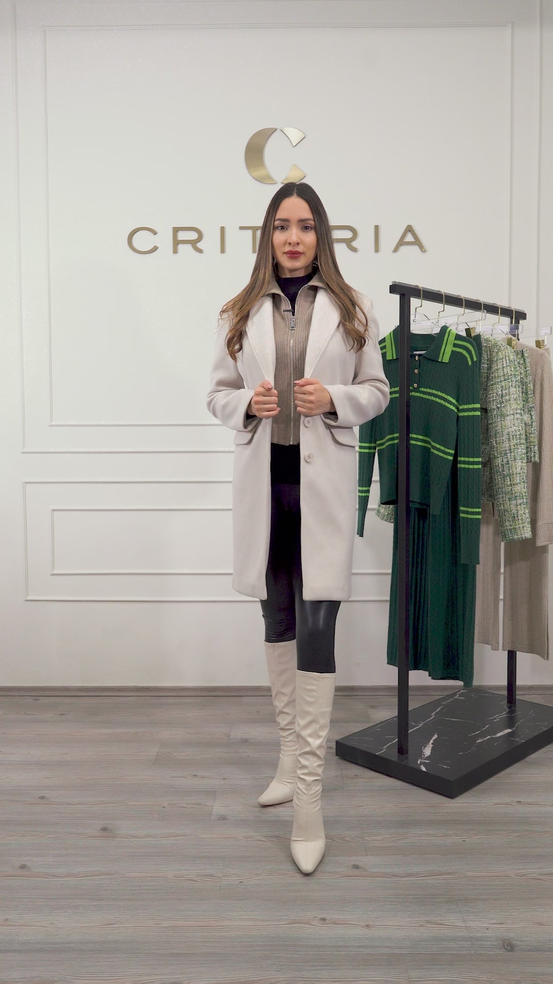Abrigo largo liso, pechera de punto con cierre fija al frente, bolsas de vivo con carteras, solapa con botones al frente, manga larga