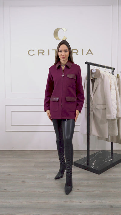 Abrigo liso, cuello y carteras en tacto piel, cuello sport, cierre al frente, bolsas de parche, manga larga