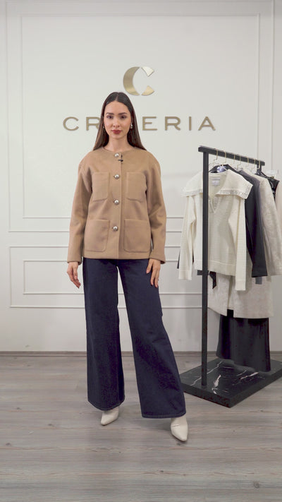 Blazer liso, cuello redondo, 4 bolsas de parche al frente, y manga oversize larga