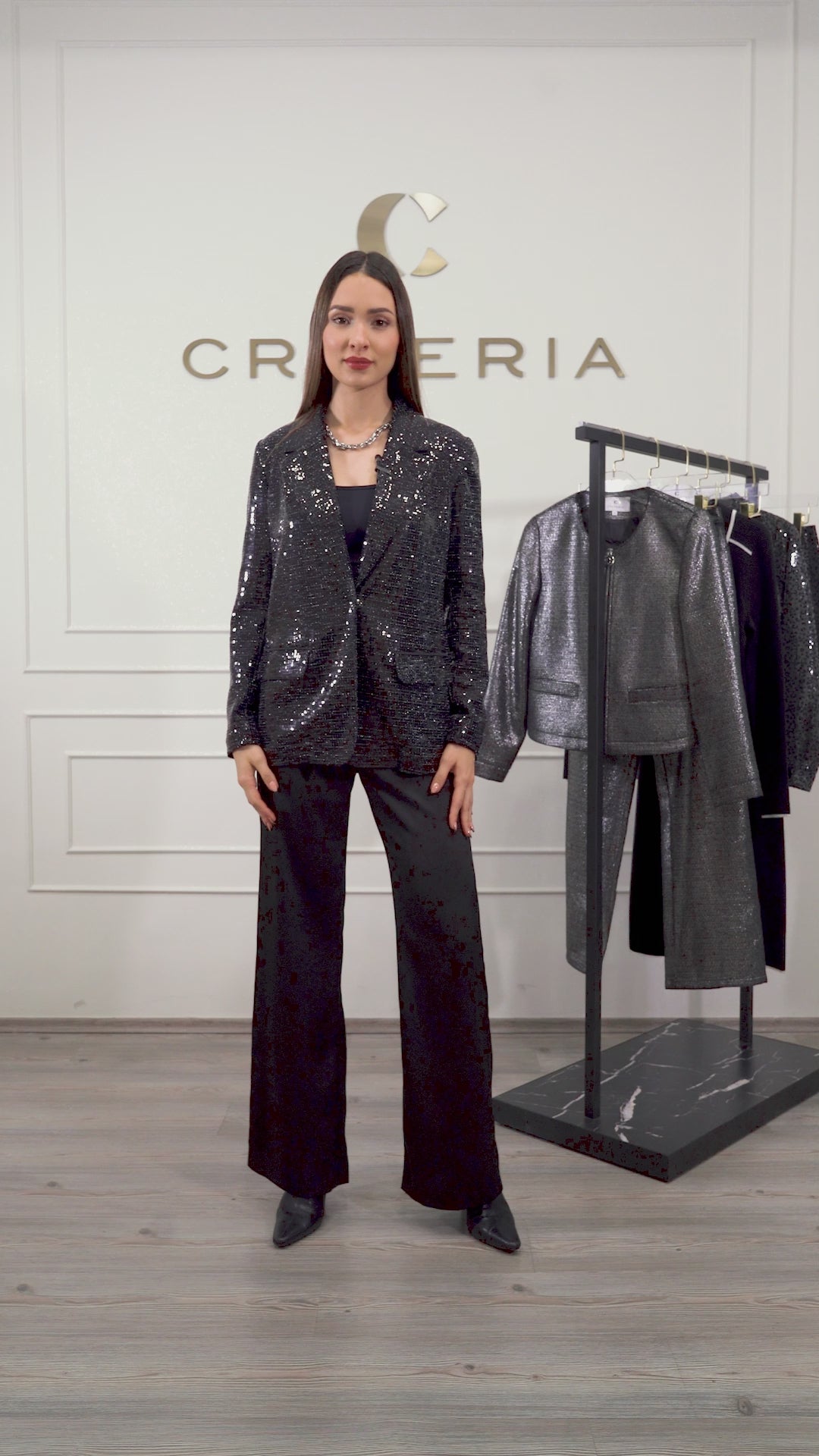 Blazer color negro con lentejuelas cuadradas, broche al frente, bolsas de vivo, y manga larga
