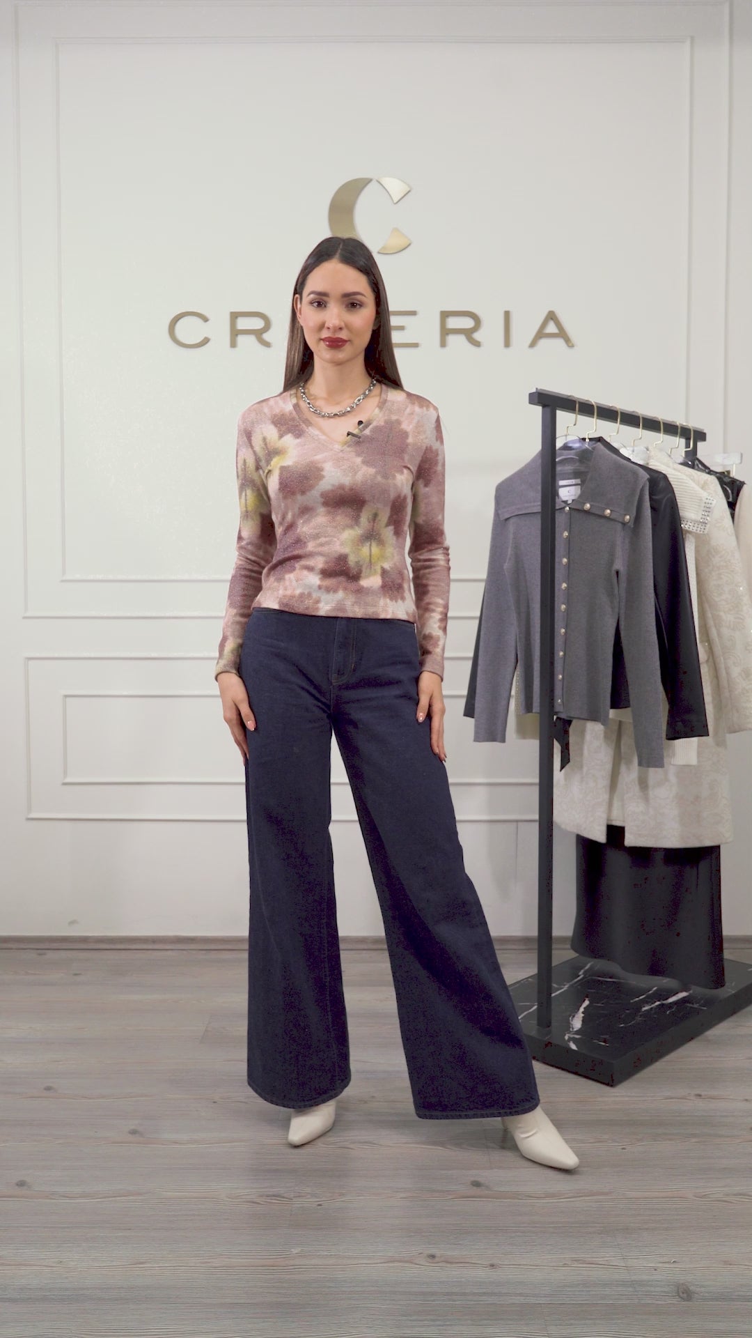 Blusa lycra estampada con lurex colo beige, escote V, y manga larga