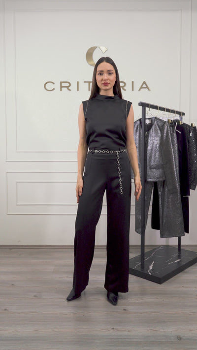 Blusa satin liso, cuello alto, gota trasera, detalle de cinta de pedrería en sisas, sin manga