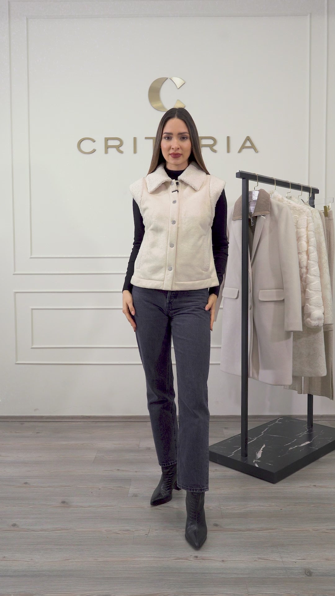 Chaleco liso en gamuza con borrega interior, cuello sport, broches al frente, bolsas vivo en costado