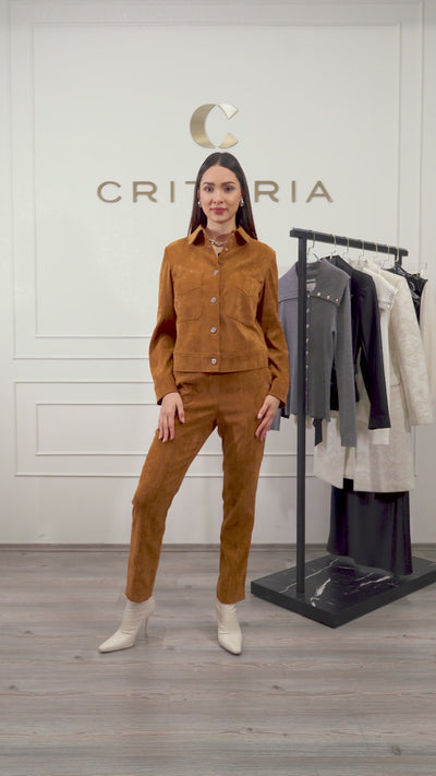 Chamarra gamuza lisa, cuello sport, broches al frente, bolsas de parche, espalda con canesú y cortes, pretina en ruedo, manga larga con puño