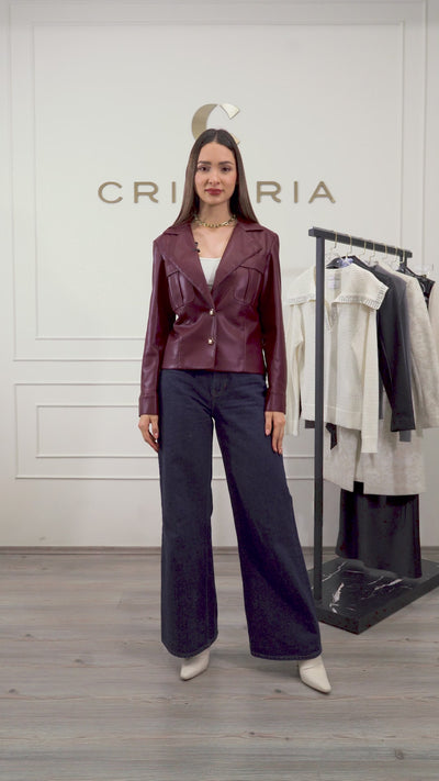 Chamarra corta en tacto piel color vino, solapa, bolsas de parche con alforzas y carteras, manga larga