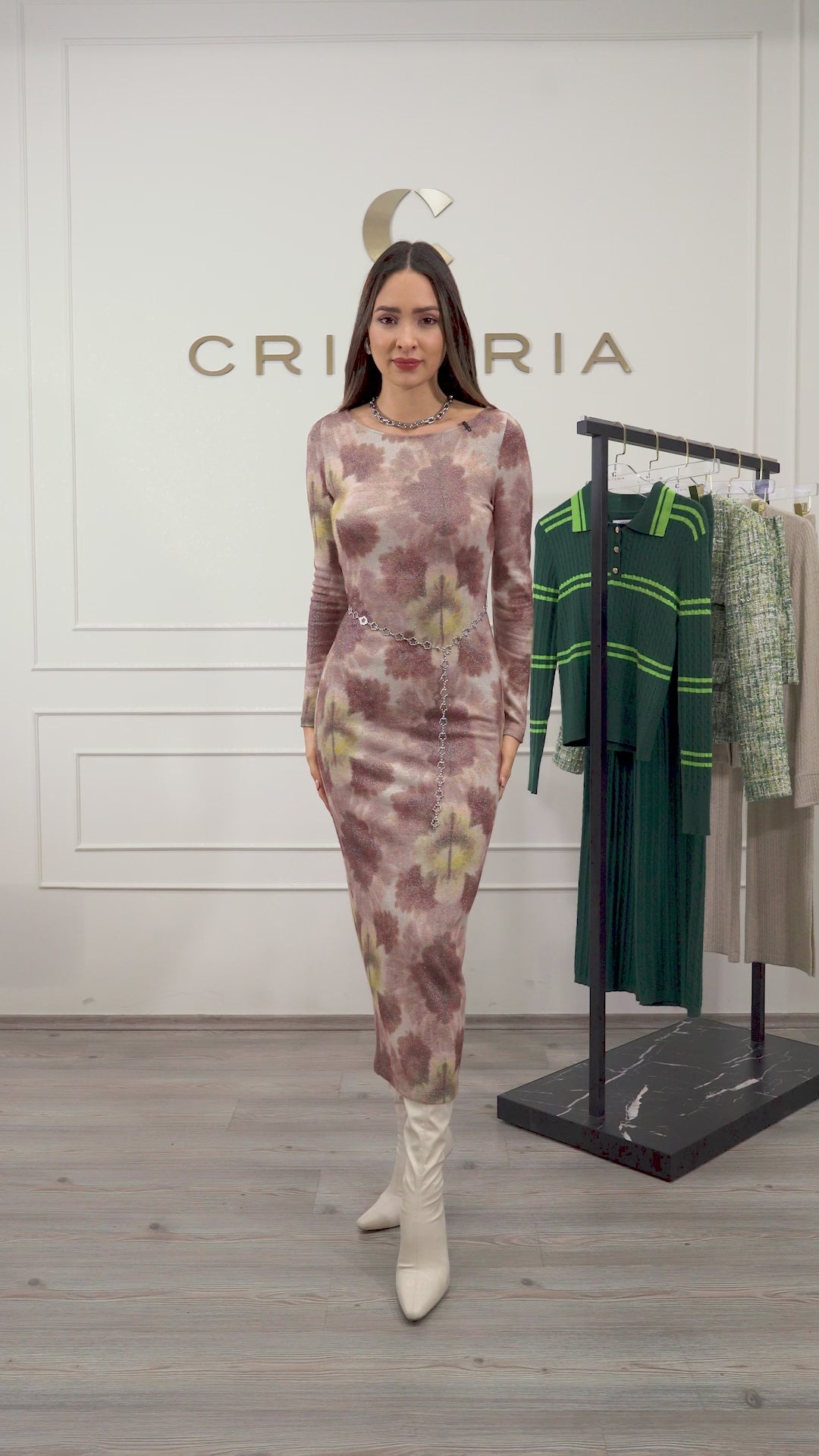 Vestido largo, lycra estampada con lurex, escote redondo, cinturón de metal de flores, abertura trasera, manga larga