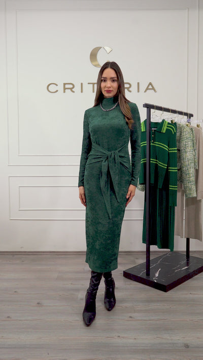 Vestido color verde de terciopelo liso cuello alto, jareta con amarre en cintura, abertura trasera, y manga larga